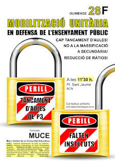 Així mateix emplacem a tots els grups parlamentaris i grups municipals de Catalunya a que presentin mocions en contra del tancament d’aules, per la reducció de ràtios i per les construccions dels centres públics que garanteixin una oferta de places publiques suficient a tots els municipis.